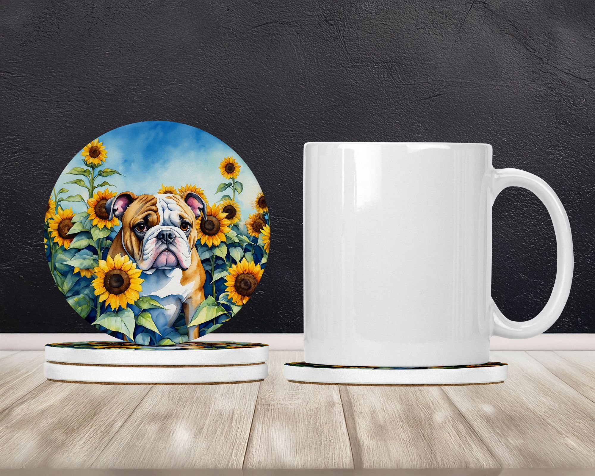 English Bulldog in Sunflowers Large Sandstone Coasters Pack of 4 Absorbent Round Coasters Decor Gifts for Men or Women, 4 in, Multicolor