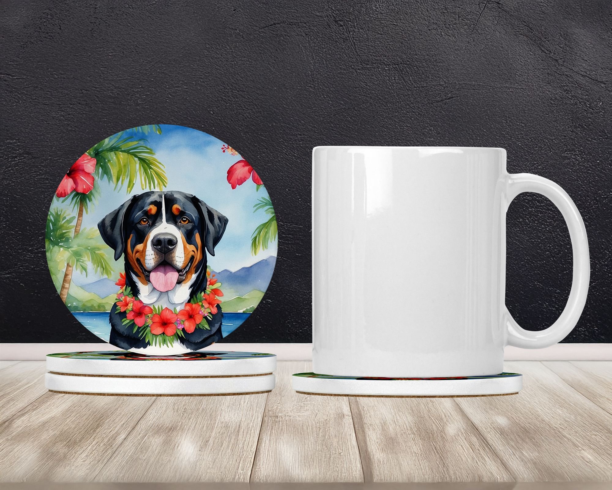 Home > Greater Swiss Mountain Dog Luau Large Sandstone Coasters Pack of 4 Absorbent Round Coasters Decor Gifts for Men or Women, 4 in, Multicolor