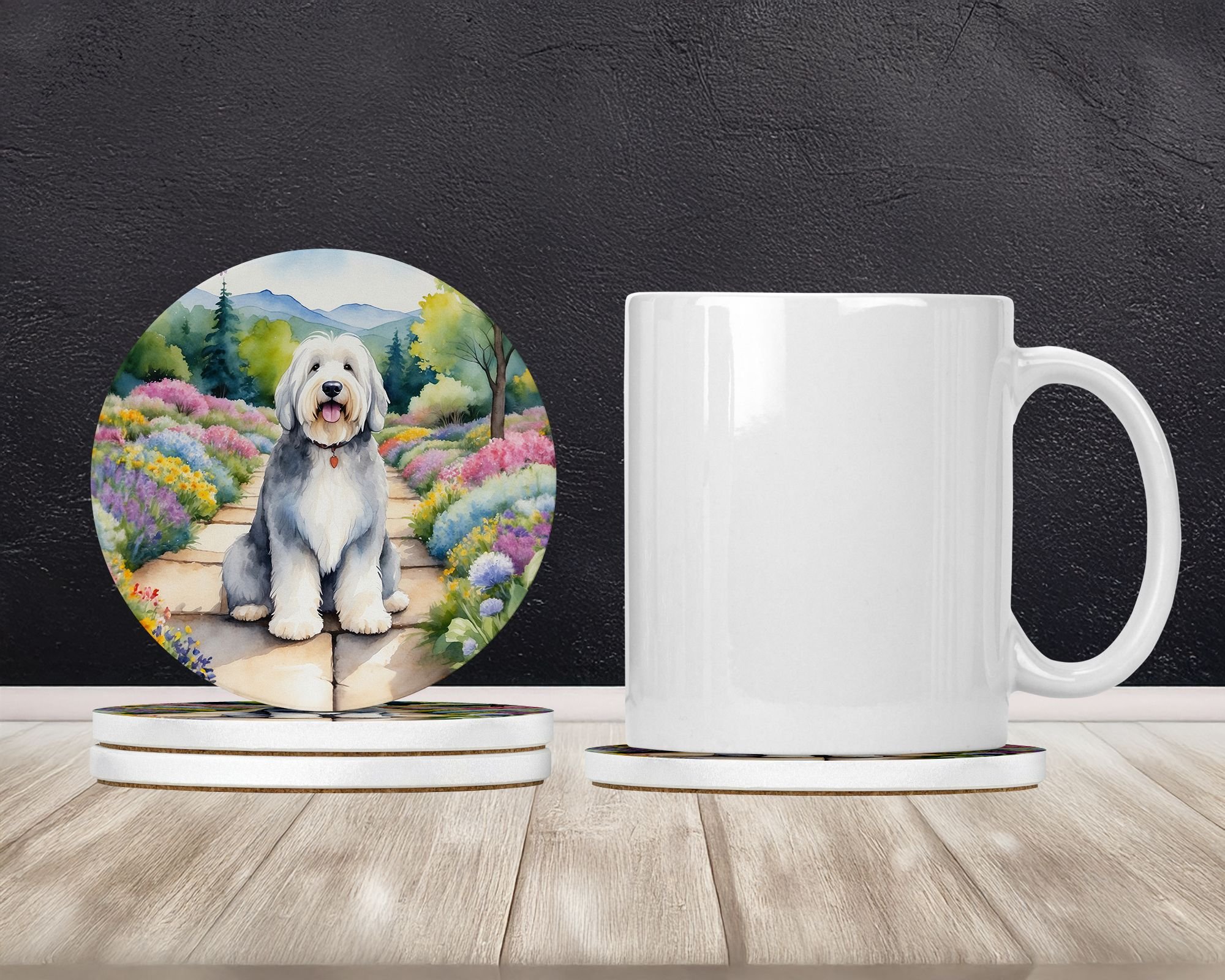 Old English Sheepdog Spring Path Large Sandstone Coasters Pack of 4 Absorbent Round Coasters Decor Gifts for Men or Women, 4 in, Multicolor