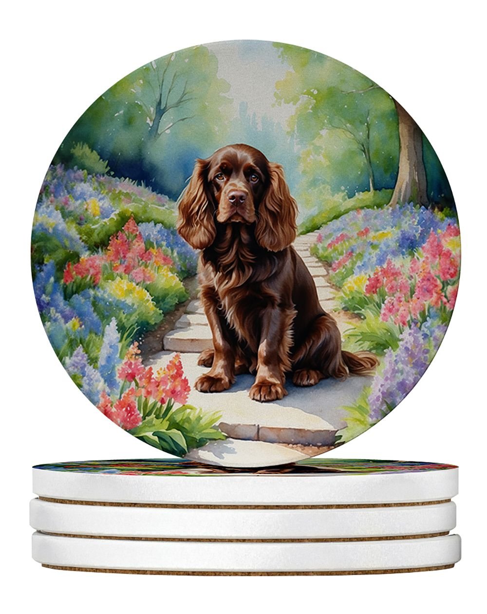 Sussex Spaniel Spring Path Large Sandstone Coasters Pack of 4 Absorbent Round Coasters Decor Gifts for Men or Women, 4 in, Multicolor